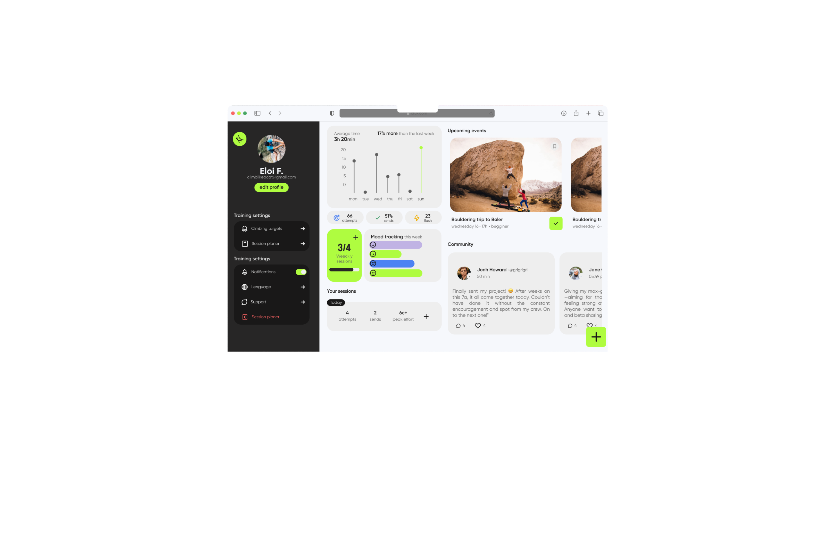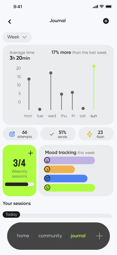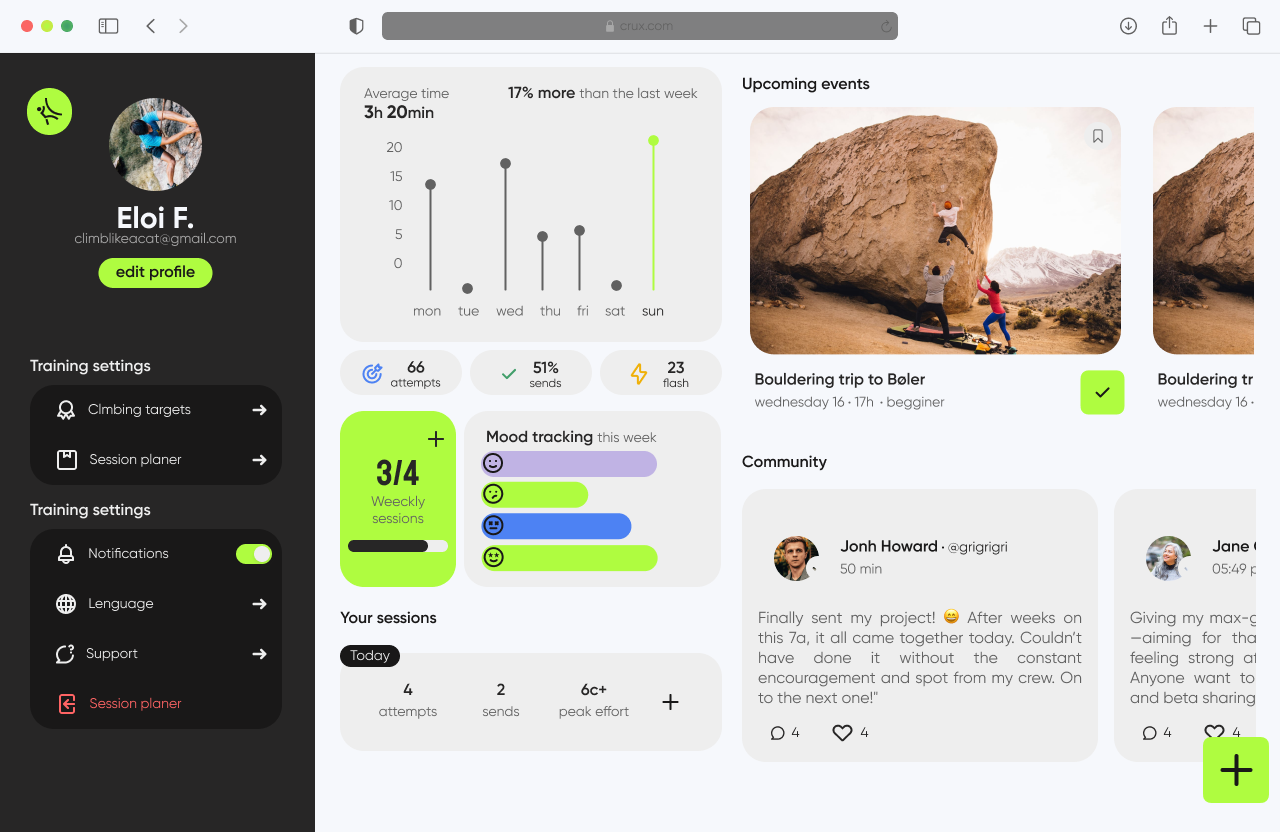 Comprehensive climbing app: Training log, connection with other climbers, and progress analysis.