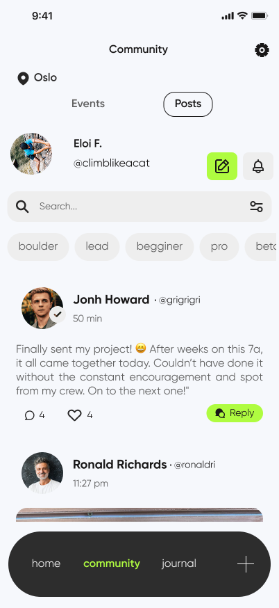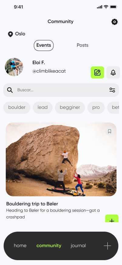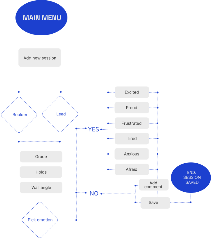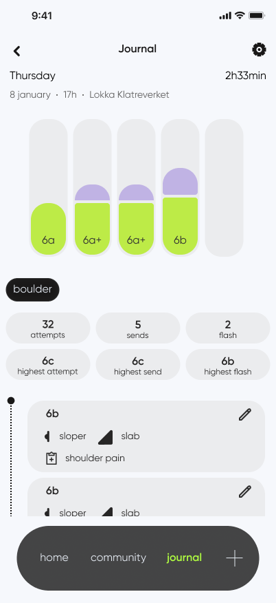 As a climber myself, I wanted to enhance the climbing experience through my Master’s final project. I embarked on the journey of designing a dynamic app that helps climbers seamlessly track their sessions, share their progress, and connect with a like-minded community. My goal was to create an engaging and accessible platform that makes indoor climbing more interactive and fosters a stronger sense of connection among climbers.