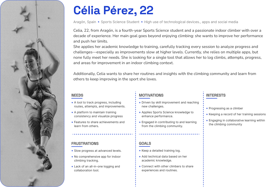 Celia, 22, from Aragón, is a fourth-year Sports Science student and a passionate indoor climber with over a decade of experience. Her main goal goes beyond enjoying climbing: she wants to improve her performance and push her limits.